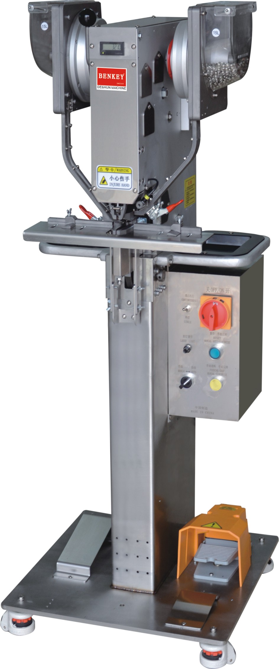 把鈕扣放進(jìn)對(duì)應(yīng)的4個(gè)料斗,開(kāi)機(jī)會(huì)自動(dòng)轉(zhuǎn)動(dòng)料斗,自動(dòng)把鈕扣排滿軌道,自動(dòng)把鈕扣送到上下模具,電動(dòng)伺服馬達(dá)帶動(dòng),只要踩下踏腳開(kāi)關(guān)便可裝訂自如,簡(jiǎn)單易用。上下模具對(duì)向運(yùn)動(dòng),穿透力好。更換配件可以裝訂其它鈕扣。