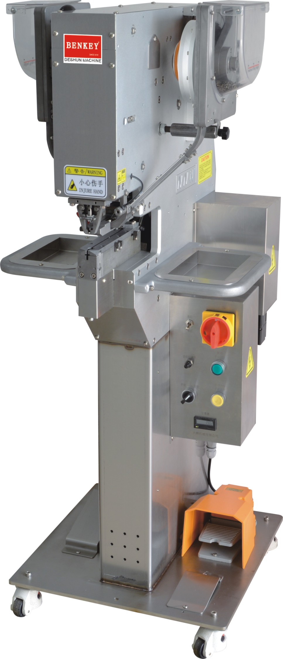 把鈕扣放進(jìn)對(duì)應(yīng)的2個(gè)料斗,開(kāi)機(jī)會(huì)自動(dòng)轉(zhuǎn)動(dòng)料斗,自動(dòng)把鈕扣排滿軌道,自動(dòng)把鈕扣送到上下模具,伺服電機(jī)驅(qū)動(dòng),只要踝下踏腳開(kāi)關(guān)便可裝訂自如,簡(jiǎn)單易用。上下模具對(duì)向運(yùn)動(dòng)穿透力好。更換配件可以裝訂其它鈕扣。
