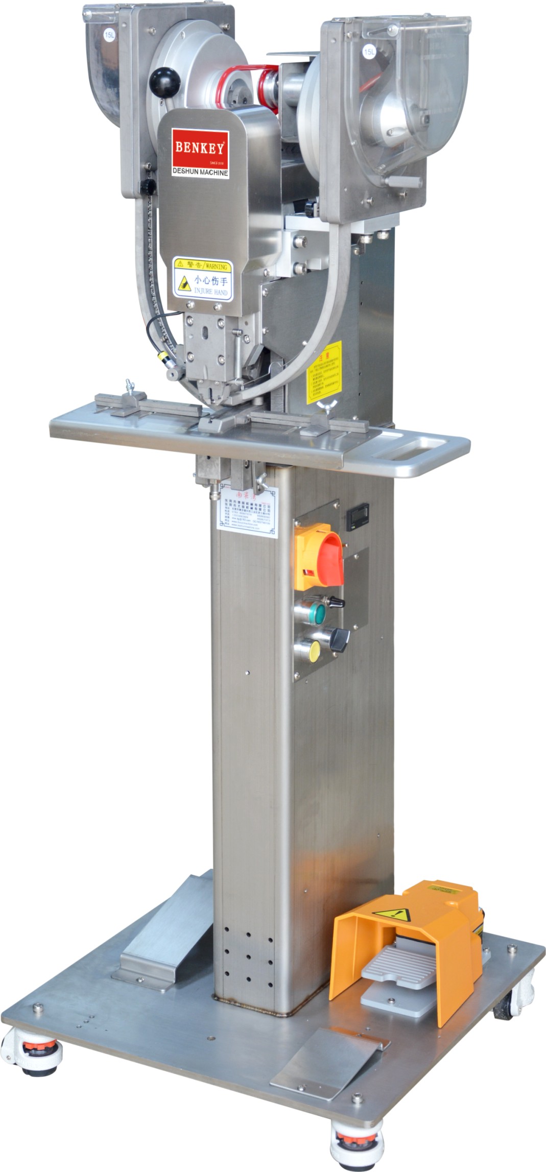 把鈕扣放進(jìn)對(duì)應(yīng)的2個(gè)料斗,開(kāi)機(jī)會(huì)自動(dòng)轉(zhuǎn)動(dòng)料斗,自動(dòng)把鈕扣排滿軌道,自動(dòng)把鈕扣送到上下模具,伺服電機(jī)驅(qū)動(dòng),只要踩下踏腳開(kāi)關(guān)便可裝訂自如,簡(jiǎn)單易用。更換配件可以裝訂其它鈕扣。